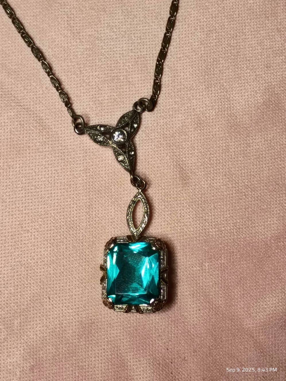 Hello! Happy to be a newbie in this very informative community! I have read and google searched and done all I can do online to seek confidence in identification of this very pretty stone in a necklace that I unfortunately inherited with my step mothers passing.