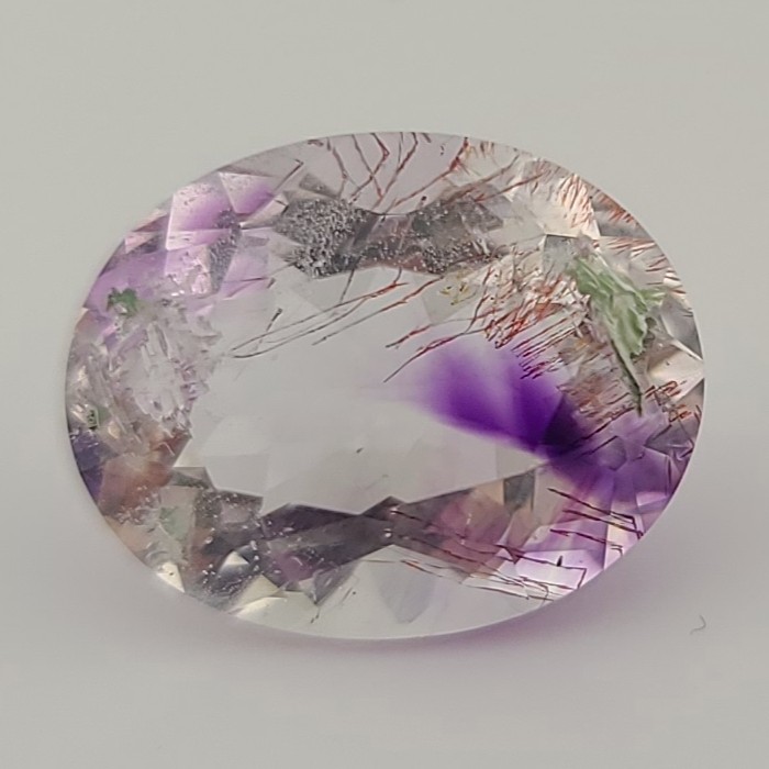 Here is a 7.22ct oval stone with some Amethyst zones, two amorphous opaque green solid inclusions (???), some negative crystals, acicular Rutile, and some amorphic red string-like globular inclusions of lepidocrocite or hematite?