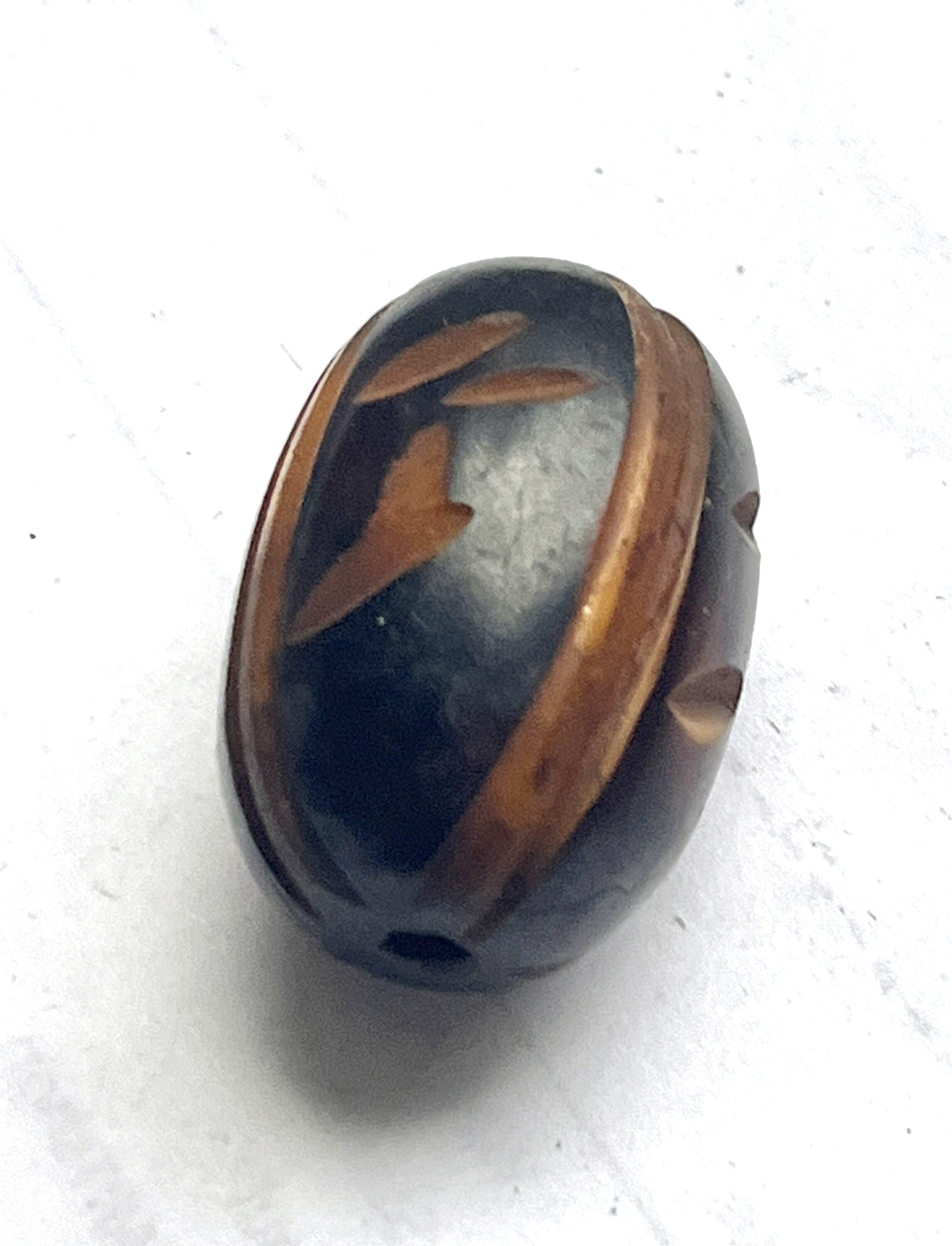 On this subject, I managed to get a very unusual bead (also Indo-Tibetan most recently, but I have no idea what the age is or where/when it wa produced). It was part of a recently strung neckless with cheap, recently made glass tZe like beads and a polypropylene string, but the bead itself is amber. What is unusual is that its surface has been treated, I think, in a way that related in a very dark brown color, except where the stone has been carved, revealing traces of the amber below). It clearly has some cultural meaning, but I am unaware what that might be, or why it was carved this way. I collect ancient beads and I feel I have a pretty good handle on many styles, but this is a first that I have encountered.