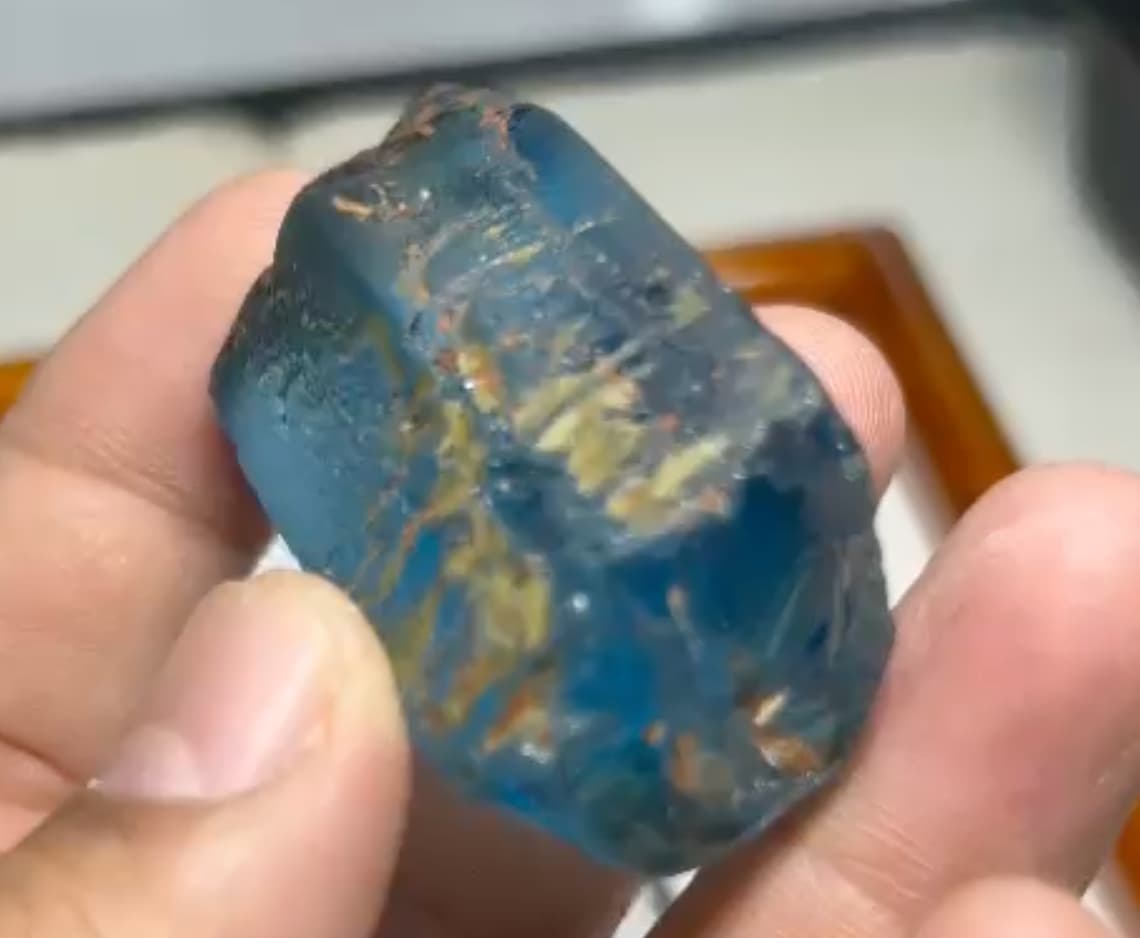 Notice the inconsistency of the angles between crystal faces? Looks suspiciously like blue glass shaped to imitate natural gem material. Many of these were sold in Bangkok earlier this year.