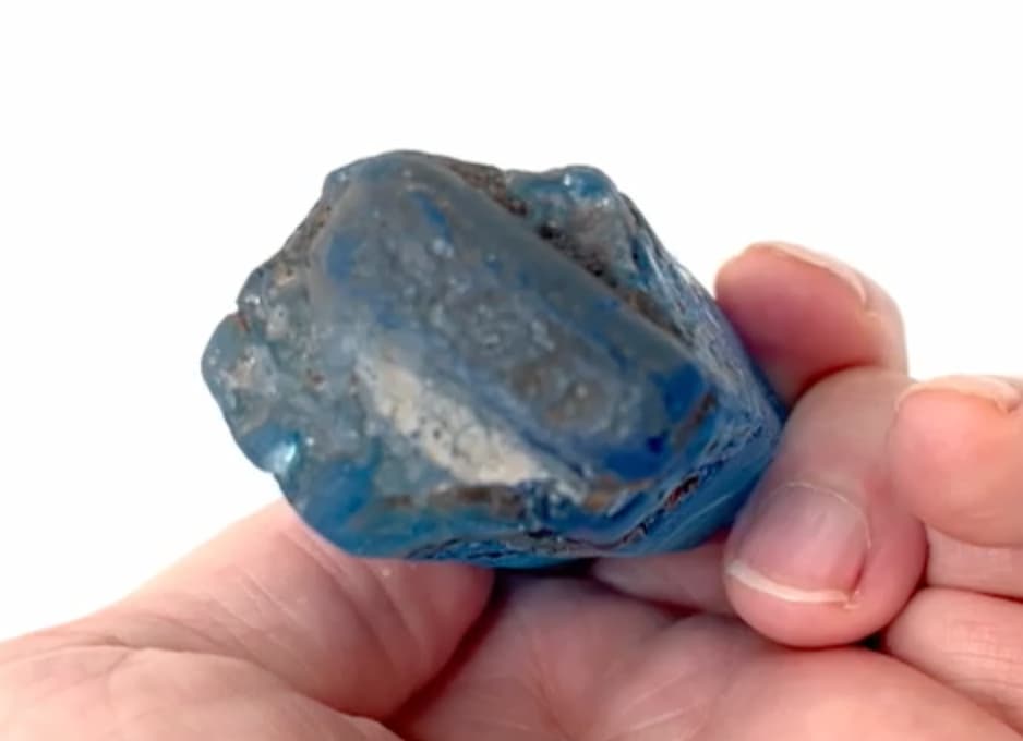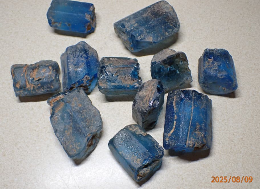 I cut thin slices of my exact same material so could exam in my petrographic scope… blue coloration is in swirls between clear glass area.. and the “glass” is slightly biaxial, apparently from stress induced by quick cooling. I agree with some earlier reply that it is the “fake material” that was generated in Indonesia for quick sale over the web. I also checked the SG and RI… both match normal old glass.